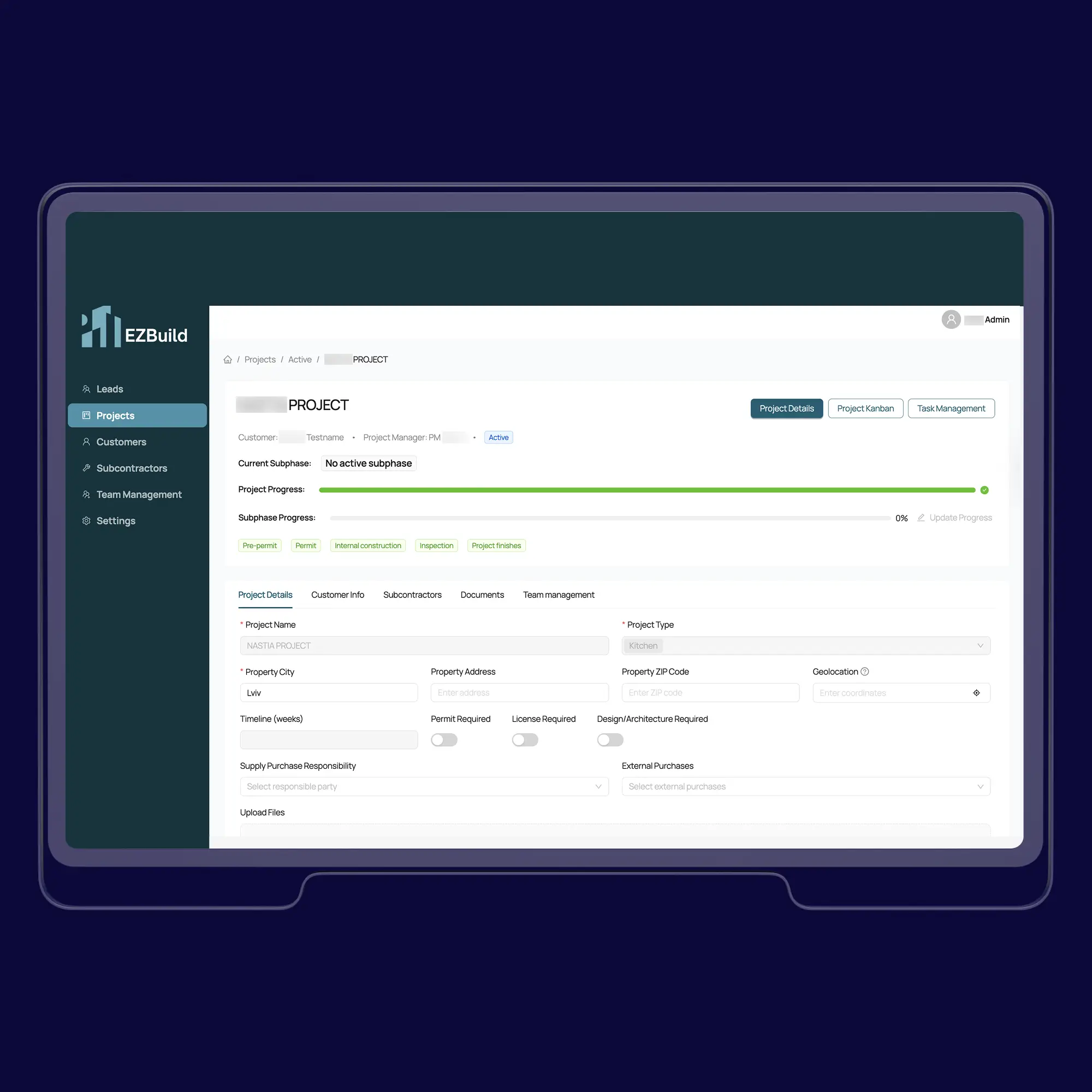 We built a unified platform that integrates subcontractor data, project documents, tasks, budgets, invoices, and communications into one interface. This eliminated the need for switching between Google Sheets, Monday.com, and other disconnected tools. Managing leads and projects through one system also resolved data silos caused by scattered integrations. In addition, mobile app access ensures that field workers and managers can update tasks, track progress, and share information instantly while on-site, improving coordination and responsiveness.